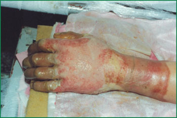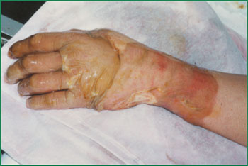 深Ⅱ度深型燒燙傷創(chuàng)面的處理: 早期按淺Ⅱ度燒燙傷創(chuàng)面的處理方法治療,5天后去掉腐皮。因真皮組織已受損,創(chuàng)面呈蠟白色,應(yīng)繼續(xù)涂藥,厚度薄于1毫米,每4小時更換一次藥膏。用藥后,可見創(chuàng)面因藥物作用而出現(xiàn)的壞死組織液化物排出,此表現(xiàn)為正常(不要誤以為是感染)。但應(yīng)注意,每次換藥前,須將創(chuàng)面上殘留的藥物及白色液化物用消毒紗布或紙巾輕輕拭去后再涂藥,大約15天后,壞死組織被液化排除,創(chuàng)面出現(xiàn)纖維隔離膜,然后繼續(xù)按上述方法治療保護(hù)纖維隔離膜,直至創(chuàng)面平皮愈合。如果治療時間超過三周,創(chuàng)面仍未愈合,表明為淺Ⅲ度創(chuàng)面,應(yīng)繼續(xù)按Ⅲ度創(chuàng)面的治療方法治療。