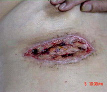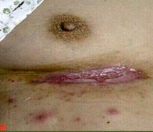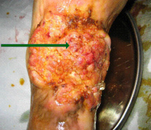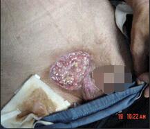 將菜花樣的腫瘤組織用手術(shù)刀削除,削到真皮下層于皮下組織交界處,而后先用美寶燒傷膏包扎,而后采用濕潤暴露療法。