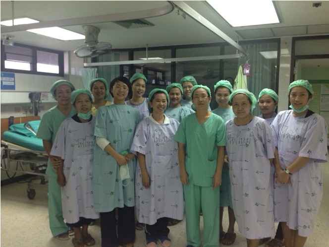 11月12日,凌晨6點(diǎn)出發(fā),美寶團(tuán)隊(duì)及Ms. Kittirat 驅(qū)車兩小時(shí)來到Rajburi Hospital, 這家醫(yī)院是該省的省立醫(yī)院,是西部較大的醫(yī)院之一,美寶已經(jīng)被納入該院的藥物目錄,但是應(yīng)用范圍仍然有限,僅用于一度燒傷及淺二度燒傷,對美寶的認(rèn)識有一定的誤區(qū),例如有的醫(yī)務(wù)人員認(rèn)為美寶不能用于面部等。這里的護(hù)士們很熱情,組織者很負(fù)責(zé),10人左右的小會議室坐了約35位護(hù)士,張美艷向護(hù)士們講解了標(biāo)準(zhǔn)換藥,尤其強(qiáng)調(diào)二次及以后換藥過程不用其它制劑,護(hù)士們的語言水平有限,但是熱情很高,可以隨時(shí)打斷講解并提問,幾位英文較好的護(hù)士主動幫助其他護(hù)士們翻譯。護(hù)士們對所展示的病例表示驚嘆,這此CNE大大加深了她們對美寶的認(rèn)識。講解結(jié)束后,張美艷隨護(hù)士長參觀了燒傷病房,該科室有8張床位,其中包括兩個(gè)單間,參觀時(shí)恰巧有一位糖尿病足患者等待換藥,張美艷及時(shí)糾正護(hù)士們的換藥方式,強(qiáng)調(diào)二次換藥不用鹽水清洗創(chuàng)面,并進(jìn)行了操作示范。