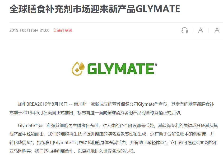 加州BREA2019年8月16日 -- 南加州一家新成立的營(yíng)養(yǎng)保健公司Glymate™宣布,其專(zhuān)有的糖平衡膳食補(bǔ)充劑于2019年6月在美國(guó)正式推出,標(biāo)志著這一面向全球消費(fèi)者的產(chǎn)品的全球營(yíng)銷(xiāo)正式啟動(dòng)。