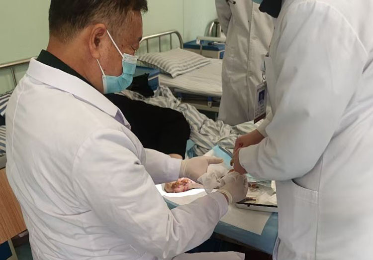 3月11日,應湖南省懷化市芷江侗族自治縣人民醫(yī)院造口門診向海英護士邀請,《中國燒傷創(chuàng)瘍雜志》編委、燒傷創(chuàng)瘍再生醫(yī)療技術臨床專家金黨軍,到科室會診嚴重糖足患者,金黨軍主任親自示范原位再生醫(yī)療技術換藥流程,強調(diào)了換藥過程中的禁忌和注意事項,并傳授了綜合治療方案。再生醫(yī)療技術在湖南省湘西地區(qū)基層醫(yī)療單位逐漸擴大普及和應用,為廣大燒傷創(chuàng)瘍患者帶來了福音。