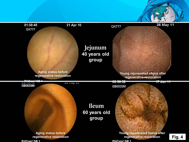 Core mechanism: The GI organ regenerative nutrients enable the tissue cells of prematurely aging GI organs and tissues to regain the stem cell development function and generate in situ new cells to replace the senescent and fibrotic cells and replenish the organ against the premature apoptosis of plenty of cells, regenerating and restoring all the prematurely aging GI organs to younger structure and function status. Attached below please find the histological rejuvenation images of animals and enteroscope images of regenerative rejuvenation of human aging GI (Fig. 3, 4).