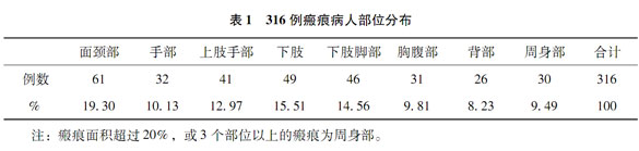 316例病人全部為深Ⅱ度以上燒傷病人,其中男性206人,占65.19%,女性110人,占34.81%,3個月內(nèi)的預防性應用154例,占48.73%。預防兼治療性應用162例,占51.17%,按預先設計的治療方法和療效評定標準評定,全部在右效范圍,右效率100%。治療部位見表1。