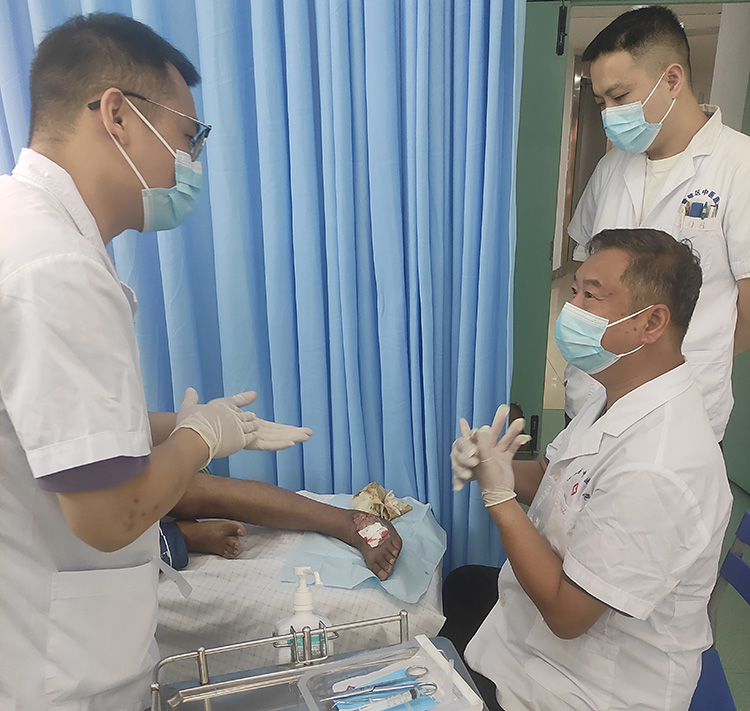 2024年9月22日, 應(yīng)黃江區(qū)中醫(yī)院外科葉峰主任邀請,《中國燒傷創(chuàng)瘍雜志》編委、燒傷創(chuàng)瘍再生醫(yī)療技術(shù)臨床專家張強來到該院會診,對一例腳部筋骨外露的透析患者現(xiàn)場示范換藥,講解換藥細(xì)節(jié),后與科室醫(yī)生就臨床中遇到的慢性創(chuàng)面的處理做了交流,此次活動極大增進(jìn)了大家對再生醫(yī)療技術(shù)的了解,增強了運用技術(shù)治療慢性創(chuàng)面的信心!