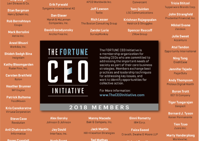 《財富》CEO倡議是《財富》雜志在2017年成立的組織,從財富500強中挑選出104位CEO商討商業(yè)組織如何通過共同合作在創(chuàng)造財富的同時使世界變得更好。這也是響應(yīng)2016年教皇方濟各對財富500強的期望-其中的精英CEO、學者和慈善家們能夠合作為世界貧困問題提供解決策略來促進世界繁榮。