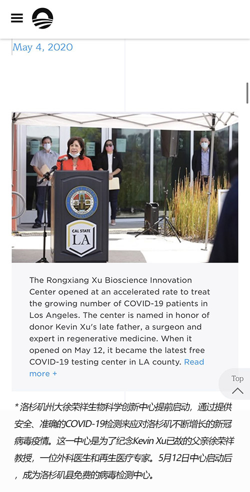 新冠肺炎疫情期間,洛杉磯州大徐榮祥生物科學(xué)創(chuàng)新中心設(shè)立為了新冠肺炎免費(fèi)檢測點(diǎn)。奧巴馬基金會(huì)將這一充滿溫情的信息與系列或感人或激勵(lì)的暖心小故事一起登于官網(wǎng),在艱難時(shí)刻傳遞希望與愛。