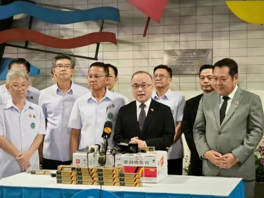 10月2日下午,受中國駐泰國大使韓志強(qiáng)的委托,公使吳志武在廊曼國際機(jī)場舉行了美寶濕潤燒傷藥膏的交接儀式。泰國衛(wèi)生部長頌薩、司法部長塔威親臨現(xiàn)場,共同見證了這一時刻,并向中方表達(dá)了深深的感激之情。