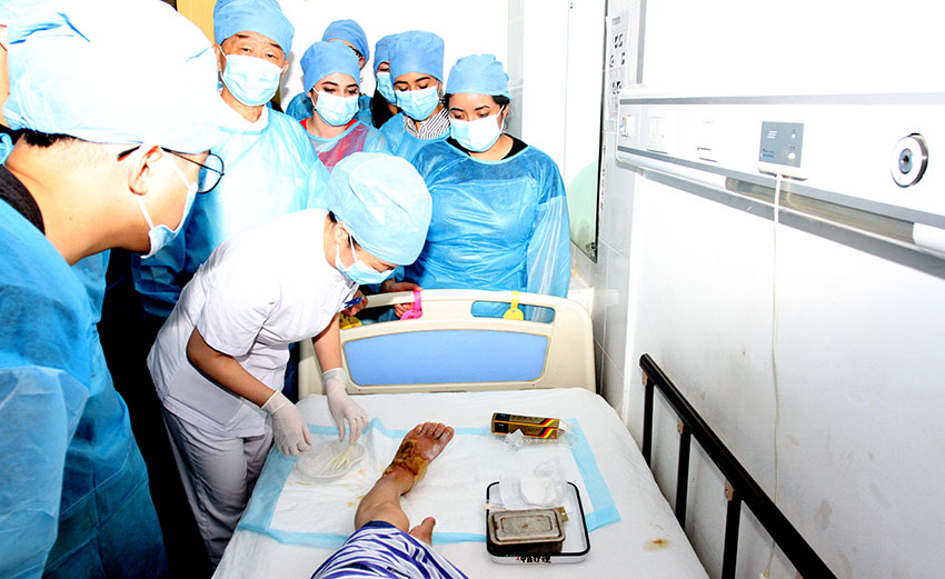 美國師生團一行在外科病房全程觀摩了醫(yī)護人員為燒傷和糖尿病足患者換藥的全過程。并由護士長手把手地為美國護理專業(yè)的學生傳授燒傷創(chuàng)瘍再生醫(yī)療技術(shù)規(guī)范換藥方法。