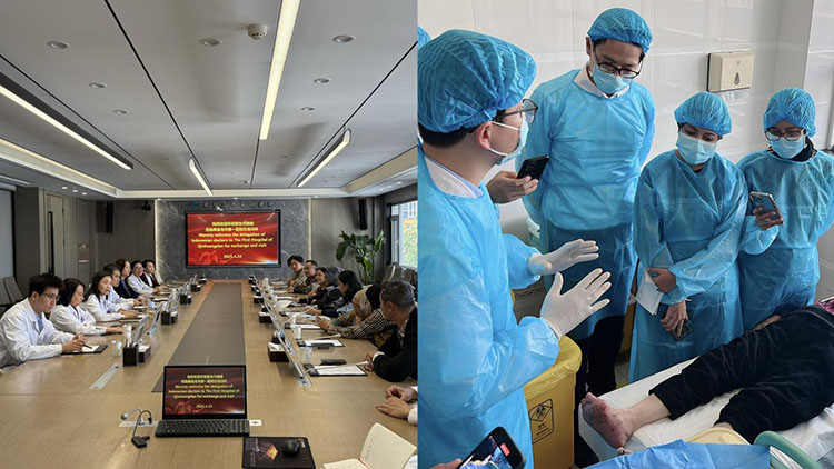 23日,代表團抵達北京市豐臺區(qū)中醫(yī)醫(yī)院,醫(yī)院燒傷整形與創(chuàng)面修復科組織了內(nèi)容豐富的參觀與學術交流活動。上午,代表團參觀了病區(qū)與門診,并觀摩了急慢性創(chuàng)面的再生醫(yī)療技術規(guī)范換藥操作。隨后,醫(yī)院醫(yī)護人員圍繞糖尿病足潰瘍、大面積燒傷、褥瘡等臨床案例進行了詳細講解。來自印尼的兩位醫(yī)生也分享了該技術在印尼的臨床應用經(jīng)驗,引發(fā)了現(xiàn)場的積極討論,拓寬了雙方在創(chuàng)面管理領域的理解與交流。