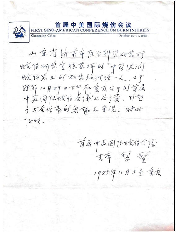 3、1985年10月,發(fā)明人出席重慶首屆中美國際燒傷會議,發(fā)表了濕潤燒傷膏的研究論文,盛志勇主持會議,引起與會者重視,大會主席黎鰲教授寫出證明信函,望山東省支持徐榮祥的燒傷研究,隨之濟(jì)南市衛(wèi)生局誹謗是假信。(原件一直保留,只給他們看,沒交給他們,以下是原件)從此矛盾激化。衛(wèi)生局黨委發(fā)出最后通知,1986年8月31日,在局黨委書記辦公室寫了辭職報告(1986年9月1日,國家發(fā)布科技人員可辭職的文件生效日)。
