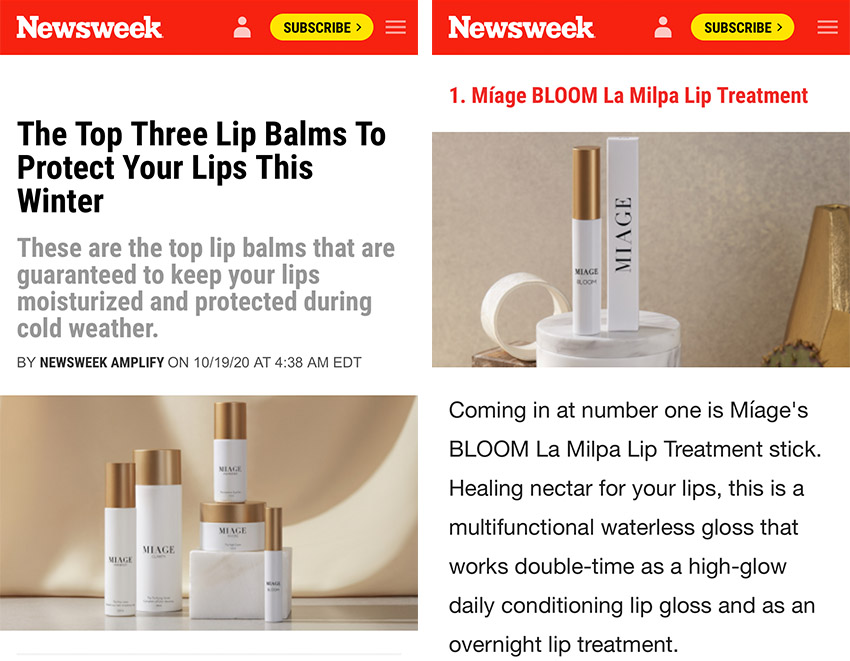 當?shù)貢r間2020年10月19日,美國《新聞周刊》發(fā)文推薦秋冬季最值得擁有的三種護唇膏,排在首位的是被譽為唇部甘露的BLOOM多功能護唇膏,美寶集團美國新品MIAGE系列之核心產(chǎn)品。