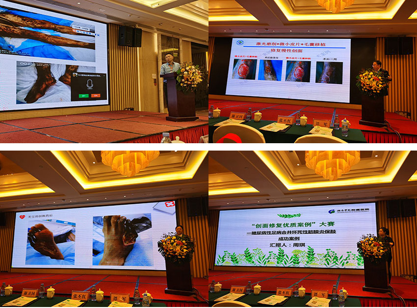 第二屆“榮祥杯”病例大賽一等獎獲得人員分別作了參賽病例的匯報,為各基層醫(yī)護人員規(guī)范使用再生醫(yī)療技術(shù)的努力和發(fā)展提供了方向和標桿。婁底市第一人民醫(yī)院周勇以《再生醫(yī)療技術(shù)在特重度燙傷100%TBSA 患者中的應(yīng)用》為主題;瀏陽市人民醫(yī)院焦獻功以《美寶濕潤燒傷膏治療特大面積燒傷創(chuàng)面》為核心;湖南省人民醫(yī)院姚夢枝以《為糖尿病患者保駕護航--多學科診療合作(MDT)》為方向;湘南學院附屬醫(yī)院周琪以《一糖尿病性足病合并壞死性筋膜炎保肢成功案例》、中南大學湘雅三醫(yī)院胡蛟以《一例壓力性損傷合并截癱患者的創(chuàng)面修復(fù)案例 》做了現(xiàn)場病例展示。