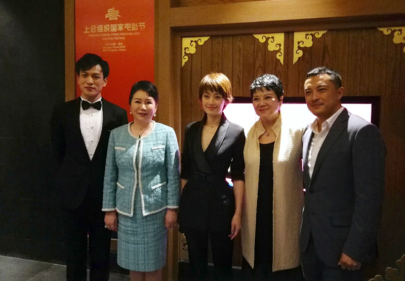 當晚,李俐(左二)作為胡玫電影《進京城》制片之一和導演胡玫(右二)演員富大龍(右一)演員馬伊琍(中)演員馬敬涵(左一)共同出席了上合組織國家電影節(jié)開幕式,拉開了此次將有近60部上合組織國家的優(yōu)秀影片的展映和評獎,一場國際影視盛會就此開啟。CCTV6電影頻道對此次活動進行了全程直播。
