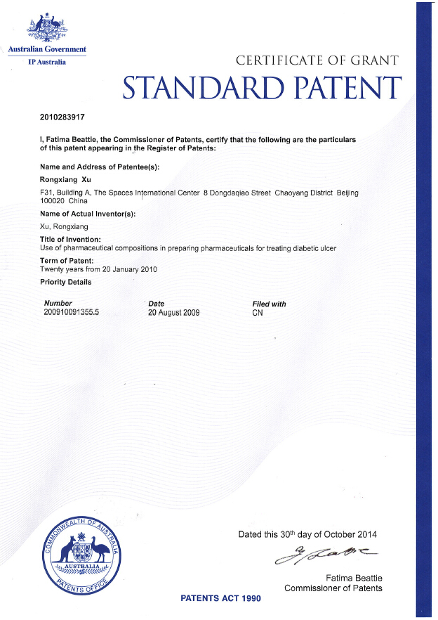 2015年2月,美寶世界知識(shí)產(chǎn)權(quán)發(fā)展進(jìn)程中又獲喜訊,徐榮祥教授的“藥物組合物在制備治療糖尿病潰瘍藥物中的用途”再獲澳大利亞專利。