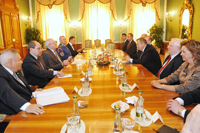 斯洛伐克共和國(guó)總統(tǒng)I. Gasparovic(左三)與IEF俱樂(lè)部成員進(jìn)行會(huì)談。