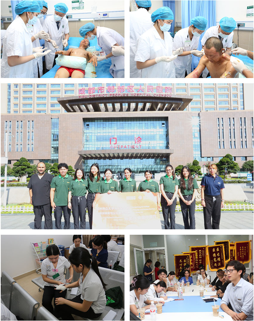 訪學(xué)之旅的首站定于成都,這座承載著古蜀文明輝煌歷史的城市。7月5日,師生們走進(jìn)成都市郫都區(qū)人民醫(yī)院,受到郫都人民醫(yī)院副院長(zhǎng)、中國(guó)中西醫(yī)結(jié)合學(xué)會(huì)燒傷專業(yè)委員會(huì)顧問(wèn)付子俊、郫都人民醫(yī)院燒傷創(chuàng)瘍科主任王鄉(xiāng)寧及多位專家的熱情歡迎。在這里,他們不僅親眼見(jiàn)證了再生醫(yī)療技術(shù)的臨床應(yīng)用奇跡,還通過(guò)觀摩美寶濕潤(rùn)燒傷膏的換藥過(guò)程及護(hù)理晨間治療,深刻感受到了醫(yī)療創(chuàng)新的力量。此外,系列專題講座更是激發(fā)了學(xué)生們對(duì)再生醫(yī)療技術(shù)濃厚的興趣與探索欲。