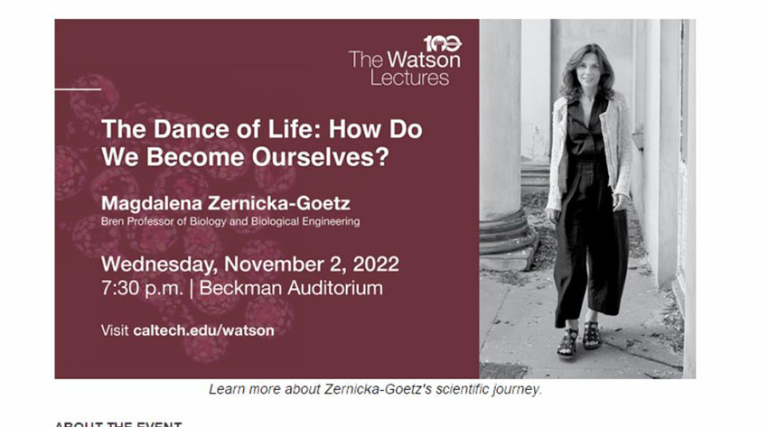 在2022年11月2日舉辦的加州理工學(xué)院一百年前設(shè)立的沃森講座(The Watson Lectures )上,加州理工學(xué)院遴選來(lái)繼承徐榮祥科學(xué)精神和路線的陳天橋雒芊芊神經(jīng)科學(xué)研究所發(fā)育生物學(xué)家、Bren生物學(xué)和生物工程教授瑪格達(dá)萊娜·澤尼克-戈茨(Magdalena Zernicka-Goetz)就“生命之舞:我們發(fā)育成人的旅程”進(jìn)行了分享。該講座采用線下線上相結(jié)合的方式進(jìn)行。