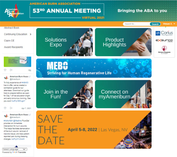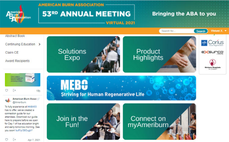 ABA線上會議不僅為燒傷領(lǐng)域的專家提供了良好的學術(shù)交流機會,也為各企業(yè)展示其產(chǎn)品與技術(shù)提供了廣闊的平臺,來自全球的40多家知名醫(yī)藥企業(yè)參加了此次會議。自2016年以來,美寶國際已經(jīng)連續(xù)4年參加了ABA年會:第49屆波士頓年會、第50屆芝加哥年會,第51屆拉斯維加斯年會,以及2020年線上會議。今年,美寶國際再度受邀參加2021年ABA線上會議,與全球?qū)<液推髽I(yè)一道,探索與推動燒傷治療的未來發(fā)展,并將繼續(xù)以再生生命科學領(lǐng)航者的身份,促進全球再生生命科學的持續(xù)發(fā)展與科技創(chuàng)新。