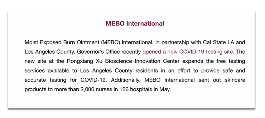 日前,美寶國際應(yīng)對新冠肺炎疫情的舉措作為典范被非營利組織Concordia特別推薦,重點介紹了加州州立大學洛杉磯分校徐榮祥生物科學創(chuàng)新中心設(shè)立為新冠肺炎免費檢測點,為當?shù)厣鐓^(qū)提供安全的COVID-19檢測,幫助阻止病毒的傳播,在新冠肺炎流行中發(fā)揮的重要作用;以及美寶國際為126家醫(yī)院2000多名護士提供護膚品的愛心舉措。