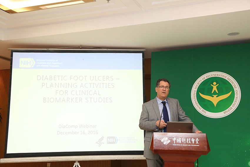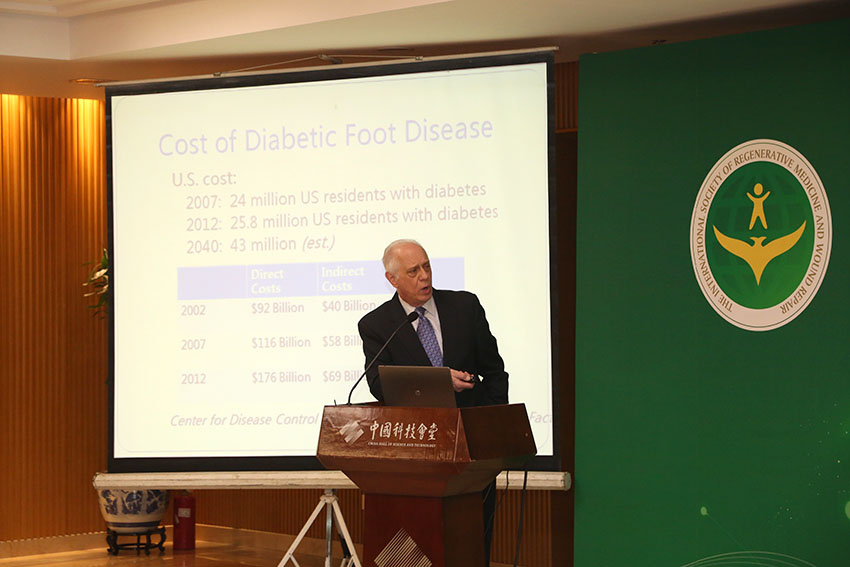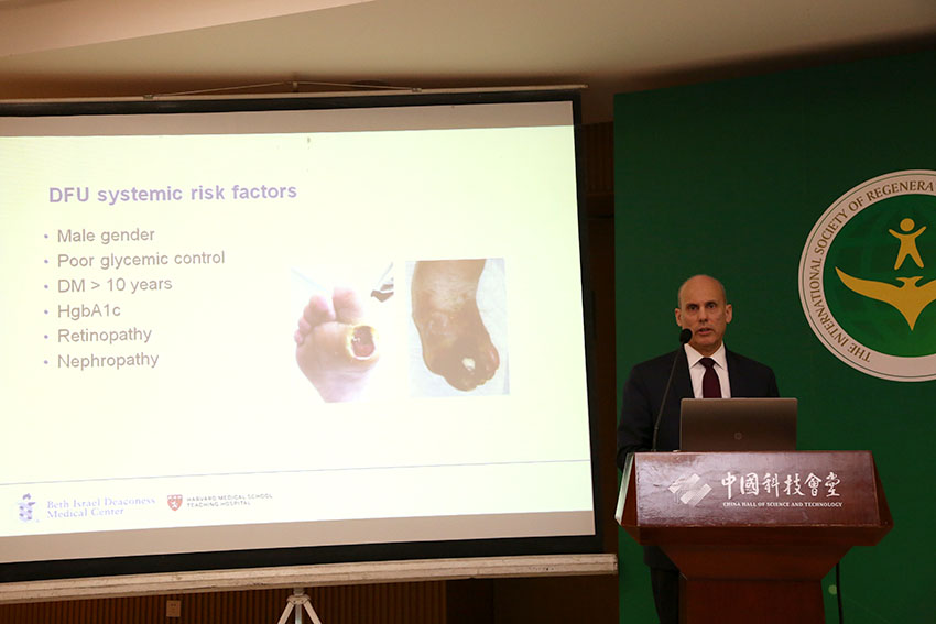 來自各醫(yī)學(xué)專家教授圍繞再生醫(yī)學(xué)與創(chuàng)面修復(fù)分別發(fā)表了重要學(xué)術(shù)演講。哈佛醫(yī)學(xué)院外科副教授、BIDMC足病科主任約翰·吉里尼博士在大會上向現(xiàn)場來賓陳述了糖尿病潰瘍發(fā)病過程及如何治療,重點剖析了足部潰瘍的原因并從病理學(xué)和微生物學(xué)檢查等方面講解了應(yīng)對及預(yù)防的措施和治療效果,從而降低截肢率。