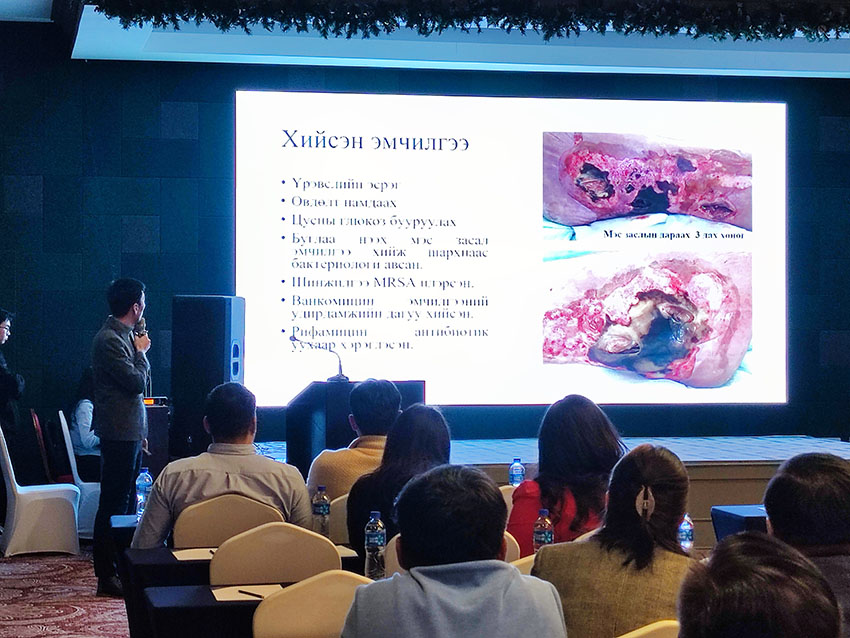 此次培訓(xùn),蒙古古爾醫(yī)院創(chuàng)傷外科主任Dr. A. Altan-Od以《蒙古古爾醫(yī)院的再生醫(yī)療技術(shù)臨床應(yīng)用成果》為題進(jìn)行了主旨講座。Dr. A. Altan-Od在演講中展示了近年來(lái)治療多種復(fù)雜難愈創(chuàng)面的經(jīng)驗(yàn),特別是糖尿病足潰瘍合并骨外露等的治療,給在場(chǎng)的創(chuàng)面專家留下了深刻的印象。