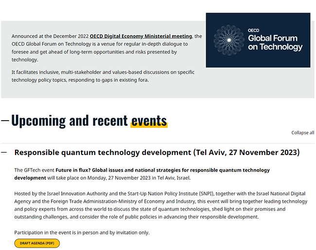本次經(jīng)合組織全球技術(shù)論壇由以色列創(chuàng)新局和創(chuàng)業(yè)國家政策研究所(SNPI)、以色列國家數(shù)字機(jī)構(gòu)和以色列對外貿(mào)易管理局-經(jīng)濟(jì)和工業(yè)部共同主辦,將匯集領(lǐng)先的技術(shù)和政策專家,討論量子技術(shù)的現(xiàn)狀,突出其前景和問題,并考慮公共政策在促進(jìn)其發(fā)展方面的重要作用。以色列、美國、丹麥、英國、奧地利、印度、日本、加拿大、巴塞羅那等國家和地區(qū)的科技部負(fù)責(zé)人、具有開創(chuàng)性的技術(shù)專家、國家政策研究中心或國家科學(xué)研究中心責(zé)任人、重要技術(shù)企業(yè)的CEO等將出席此次大會。