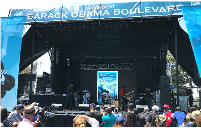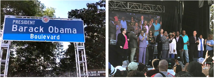 洛杉磯市于5月4日正式將羅德奧路(Rodeo Road)改名為奧巴馬大道(Obama Boulevard),以紀(jì)念美國(guó)第一位非洲裔總統(tǒng)。數(shù)千名興奮的群眾從中午開(kāi)始陸續(xù)匯集在改名后的奧巴馬大道和與其交匯的馬丁路德金大道上,以音樂(lè)會(huì)和游園會(huì)的形式歡慶奧巴馬大道在洛杉磯市正式出現(xiàn)。