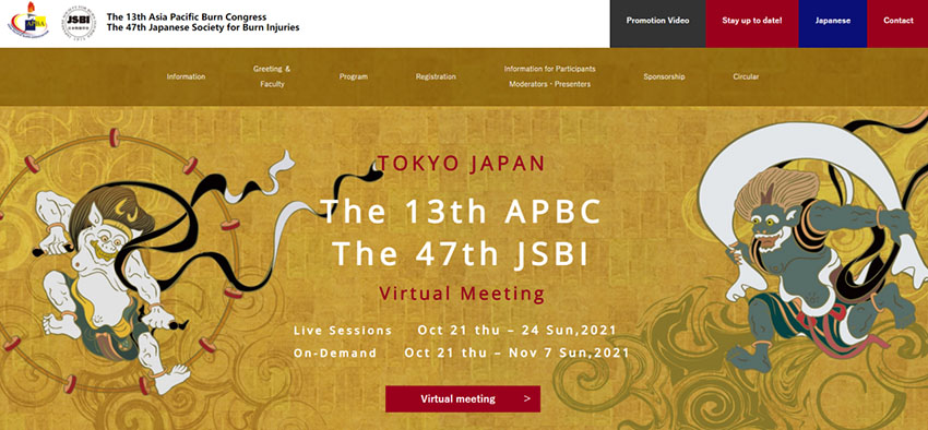 2021年10月21日至10月24日,第13屆亞太燒傷會(huì)議(APBC 2021)暨日本燒傷學(xué)會(huì)(JSBI)第47屆年會(huì)以虛擬會(huì)議的形式舉行。亞太燒傷會(huì)議是國(guó)際燒傷會(huì)議日歷上的一項(xiàng)重要活動(dòng),它匯聚了來自各國(guó)的醫(yī)生、護(hù)士及科研人員等,為全球醫(yī)務(wù)工作者分享臨床治療經(jīng)驗(yàn)、最新研究成果和臨床管理方法提供了一個(gè)寶貴的平臺(tái)。本屆大會(huì)的主題為“燒傷治療的下一次動(dòng)態(tài)變化——應(yīng)對(duì)感染、預(yù)防和控制感染”(The Next Dynamic Change in Burn Care – Coping with Infection, Infection Prevention and Control)。